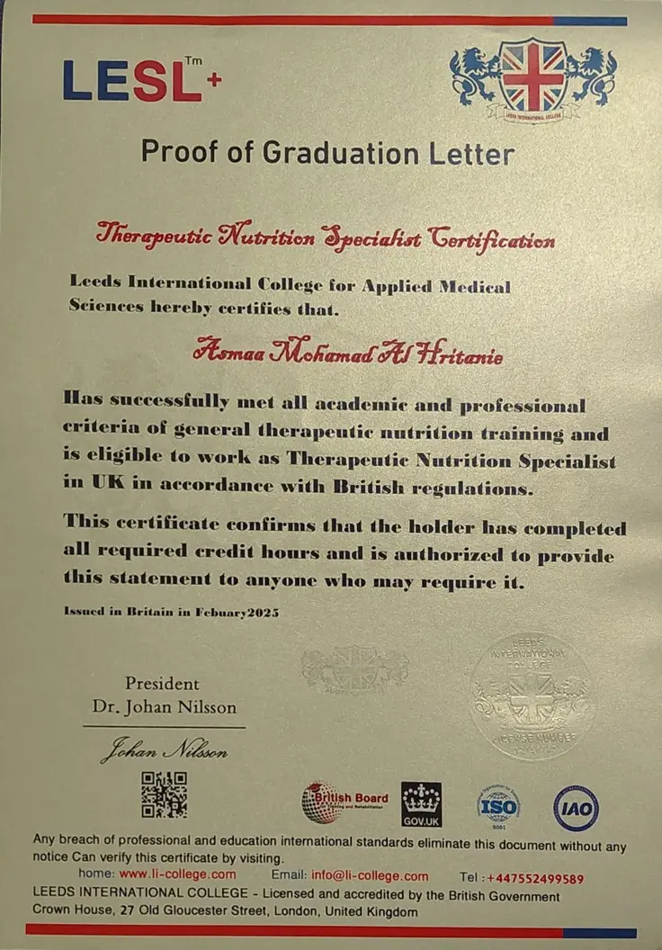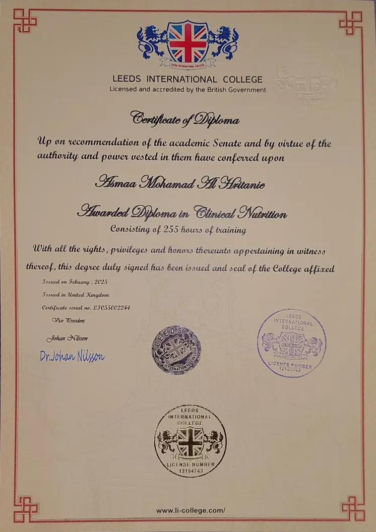 🎓 An accredited Clinical Nutrition Diploma Certificate from Leeds International College – United Kingdom, awarded after completing the required training hours, covering both the theoretical and practical aspects of Clinical Nutrition.