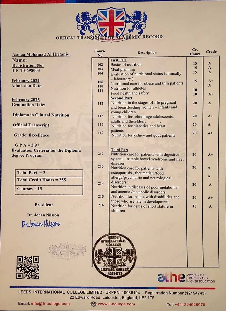 An official graduation certificate from Leeds International College, confirming the completion of all academic and professional requirements and the qualification as a certified Clinical Nutrition Specialist in accordance with UK regulations.